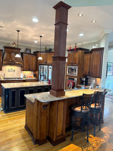 When we supply an extension kit for a PAINT-GRADE column, we supply a 1' section to be applied to the top of the column shaft. However, if you require a 9' STAIN-GRADE Column, then your column will be made differently. The lower recessed section will come 38” tall, and the upper shaft will be 70” tall. The reason being, the 1' extension on a hardwood column will not have the same grain consistency and would be noticeably different after staining. As an alternative, we split up the shaft just below the paneled section as shown on the drawing.