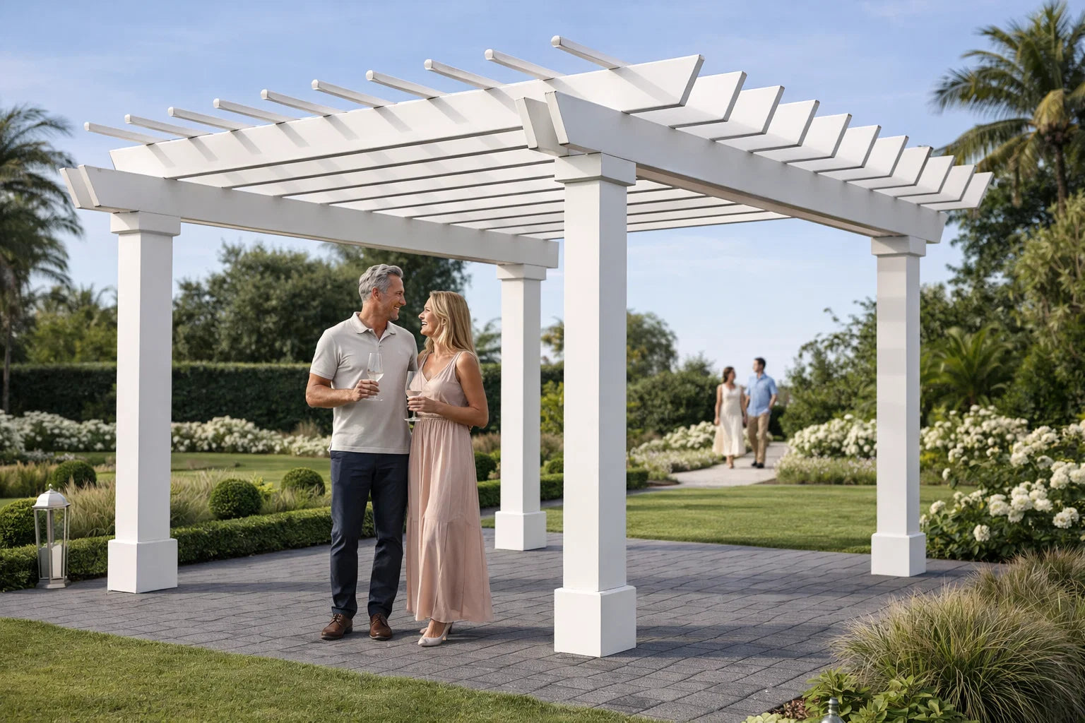 16' Traditional, Free Standing PVC Pergola Kit: Fabricated with Cellular PVC to resist fading, rotting, warping and last a lifetime without painting. Cellular PVC readily accepts paint, should you choose to paint it.