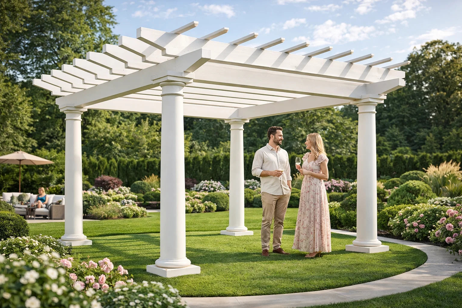 16' Modern, Free Standing PVC Pergola Kit: Fabricated with Cellular PVC to resist fading, rotting, warping and last a lifetime without painting. Cellular PVC readily accepts paint, should you choose to paint it.