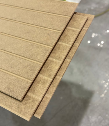 We also include six raw MDF Beaded Shiplap Panels that are ¼" thick and 16" wide with six Deep Beads about 3" apart that fit together seamlessly. The panels are 28" long for the 40" high kit, and 44 ¼" for the 56" high kit. The Upper and Lower Rails with the Cap adds 12" to the height of the panels. If you prefer something shorter, the panels can easily be cut down on-site.