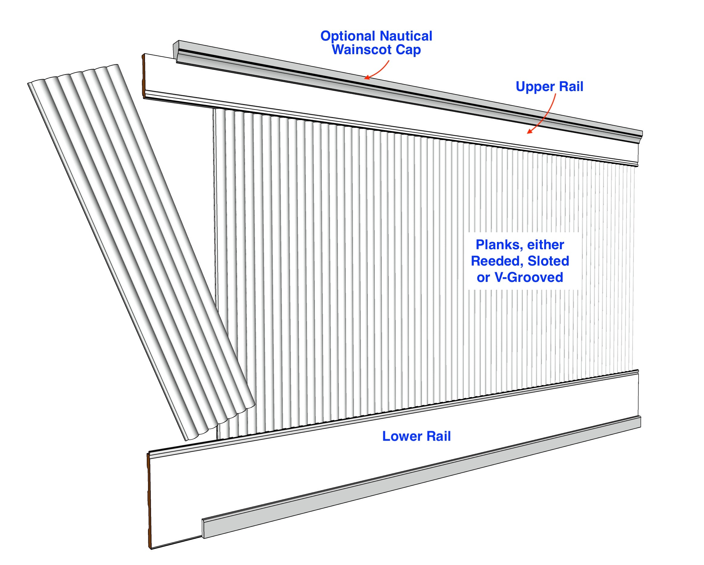Each 8' kit (95") includes 19 Shiplap Reeded Planks—27 ¼" long for 40" kits or 47 ¼" long for 60" kits—along with Upper and Lower MDF Rails and a PVC Cap and Shoe Trim. The rails and cap add about 12" to the finished height, and the panels can be trimmed on-site to match countertops or other architectural lines. A 40" overall height is recommended, but the system is flexible for custom applications.