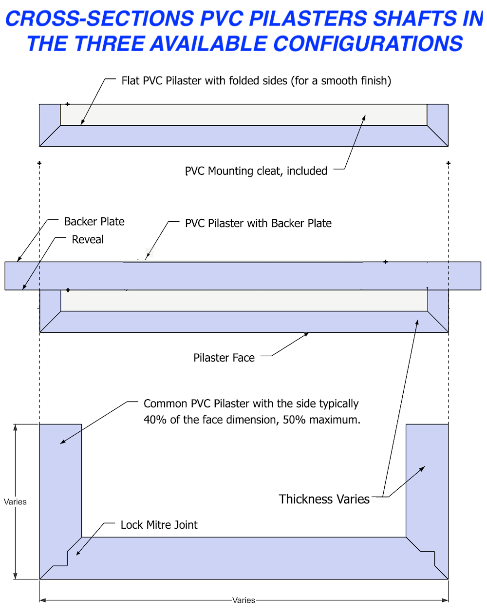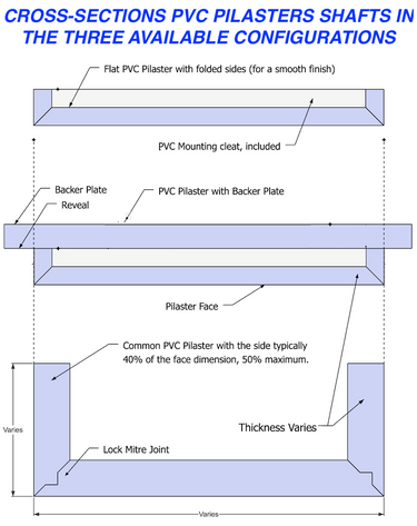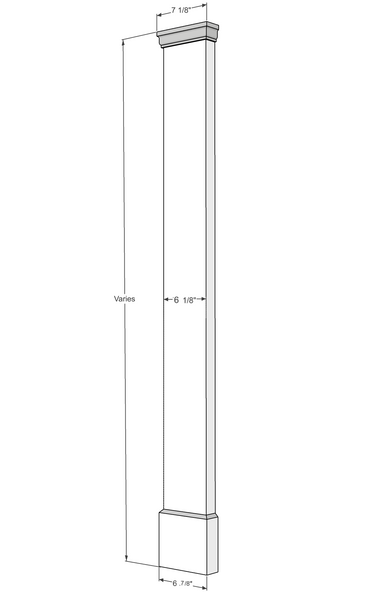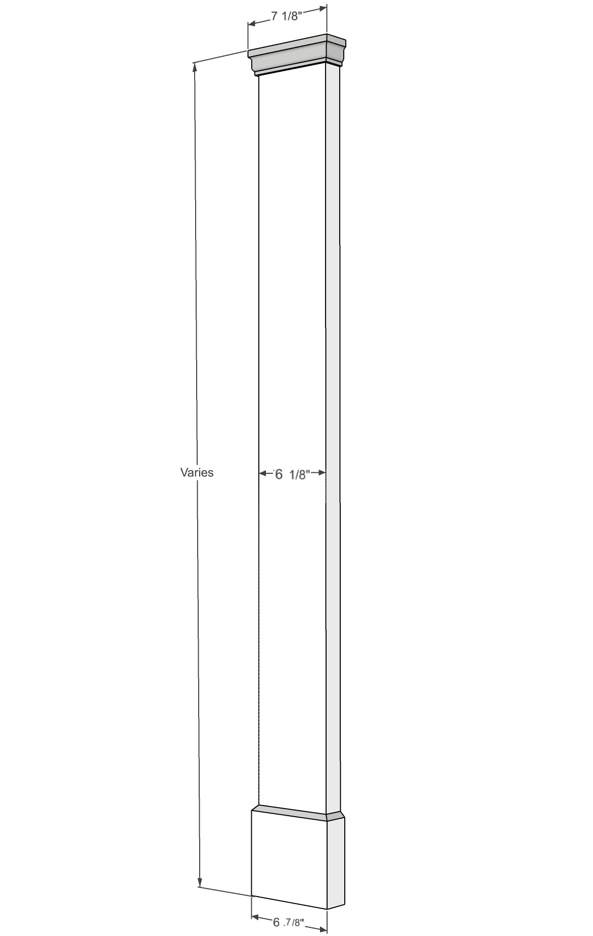 The column shaft is made from ½" thick PVC panel with miter joints for easy glue assembly. The actual outside dimension of the shaft is 6 ⅛” wide and 1 ¼" return, 5 ⅛" x ¾" inside. The Backer Plate adds ½" to the depth of the pilaster.